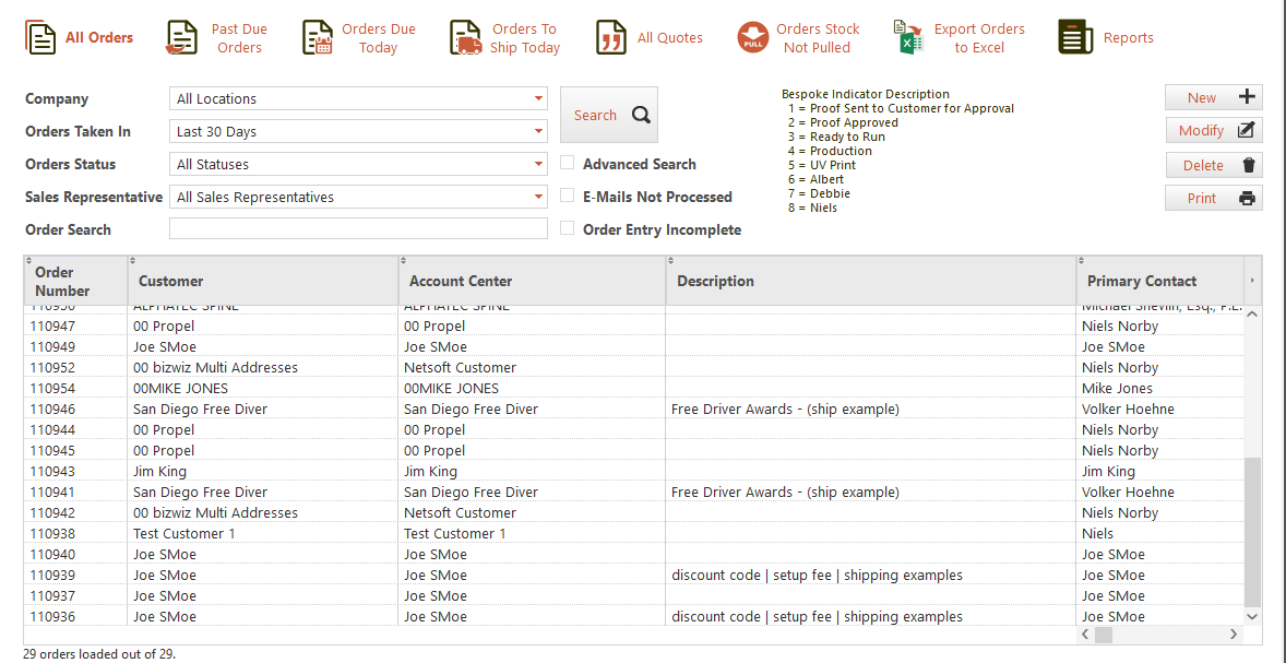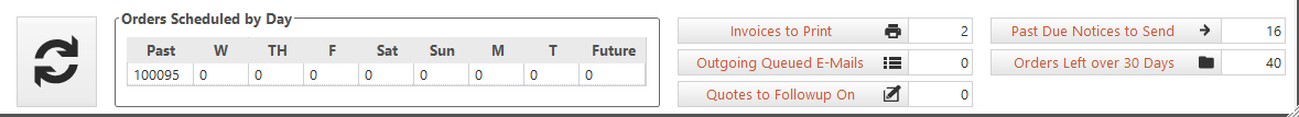 Orders Left over 30 Days: Click to open a Work With Table displaying all orders that have not been picked up in 30 days of completion.