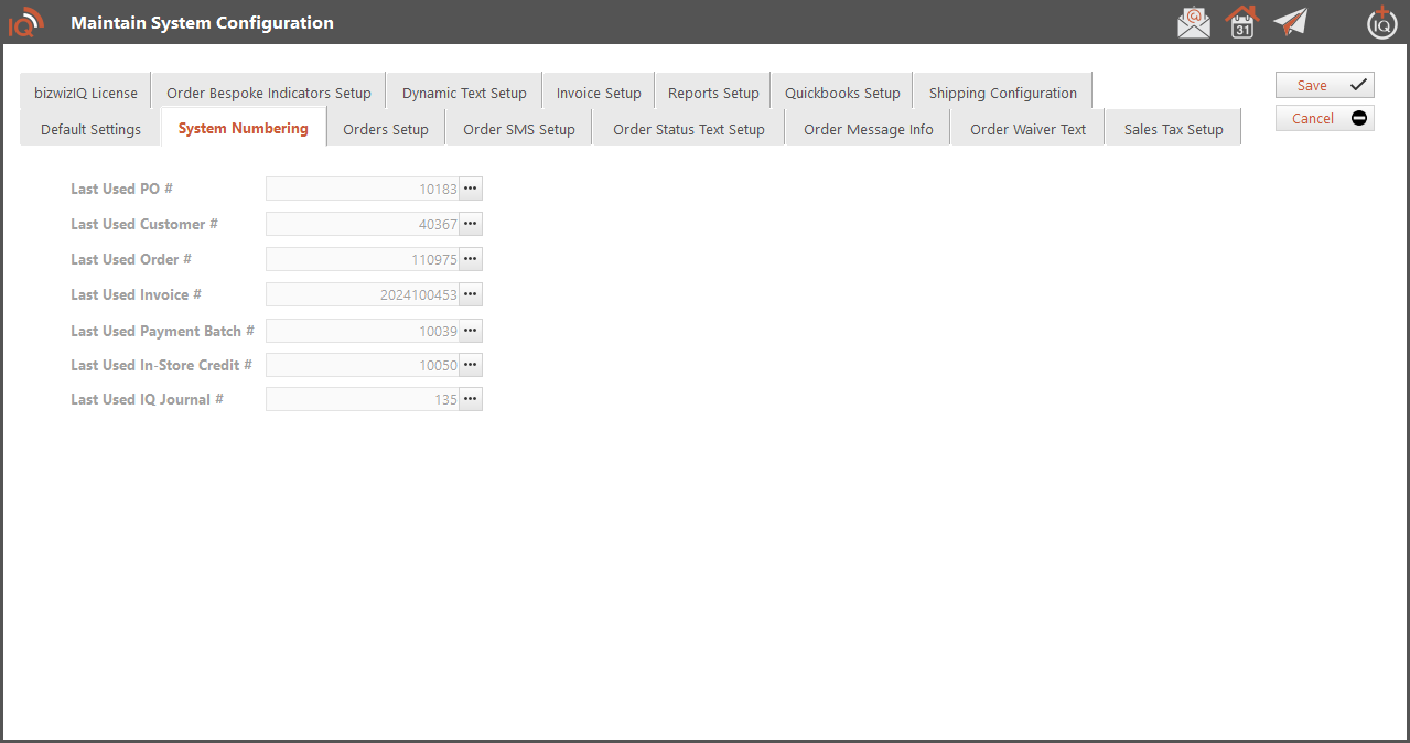 This tab will show you the last used number for various areas of Order Manager. You can click on the ... icon next to each number to set a new number.  You can only use a number that is greater than the last used number for that particular section.